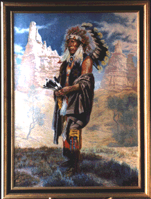 This second painting of Red Cloud (1970) is a "landscape portrait" with an unusual use of color and costume.
